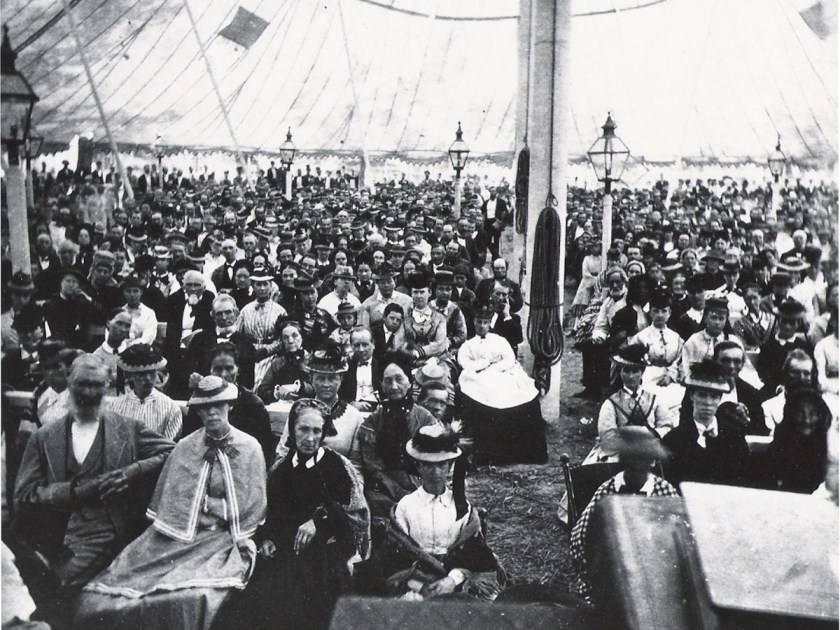 “According to appointment, this meeting was held at Alexandria, July 13-20 [1898]. The camp was situated in a beautiful grove just outside the city limits. The weather was favorable during the meeting. More of our people were in attendance than were at first expected. Five families came over one hundred miles by team. All present were glad to be at the first camp meeting held in this State.