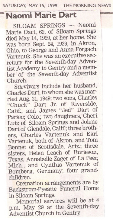 In 2011, due to mobility issues he relocated to Ryan’s Home Care where he received exceptional care until his passing on March 3, 2012. Throughout his life he flourished in both careers as a pastor and educator. Wherever he lived he brought joy, patience, kindness, understanding and love to those around him. He touched countless lives with these qualities and will be greatly missed on this earth. We do have the blessed hope of seeing him again. He relished the thought of gathering with all of his dear students, friends, colleagues and family in that great reunion in heaven (Grave, 2019). He was survived by his second wife, Connie Stewart Dart; four children, Chuck (Sherri), Cheri (Alan), Jed (Lee Lee) and Jolene (Kent); and grandchildren Chad, Kristi, Caroline and Heidi (Recorder, 2012).